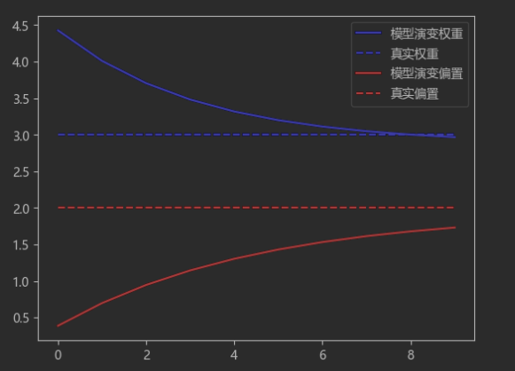 经过训练,明显接近真实值。只要进行足够的训练,就越接近真实值。