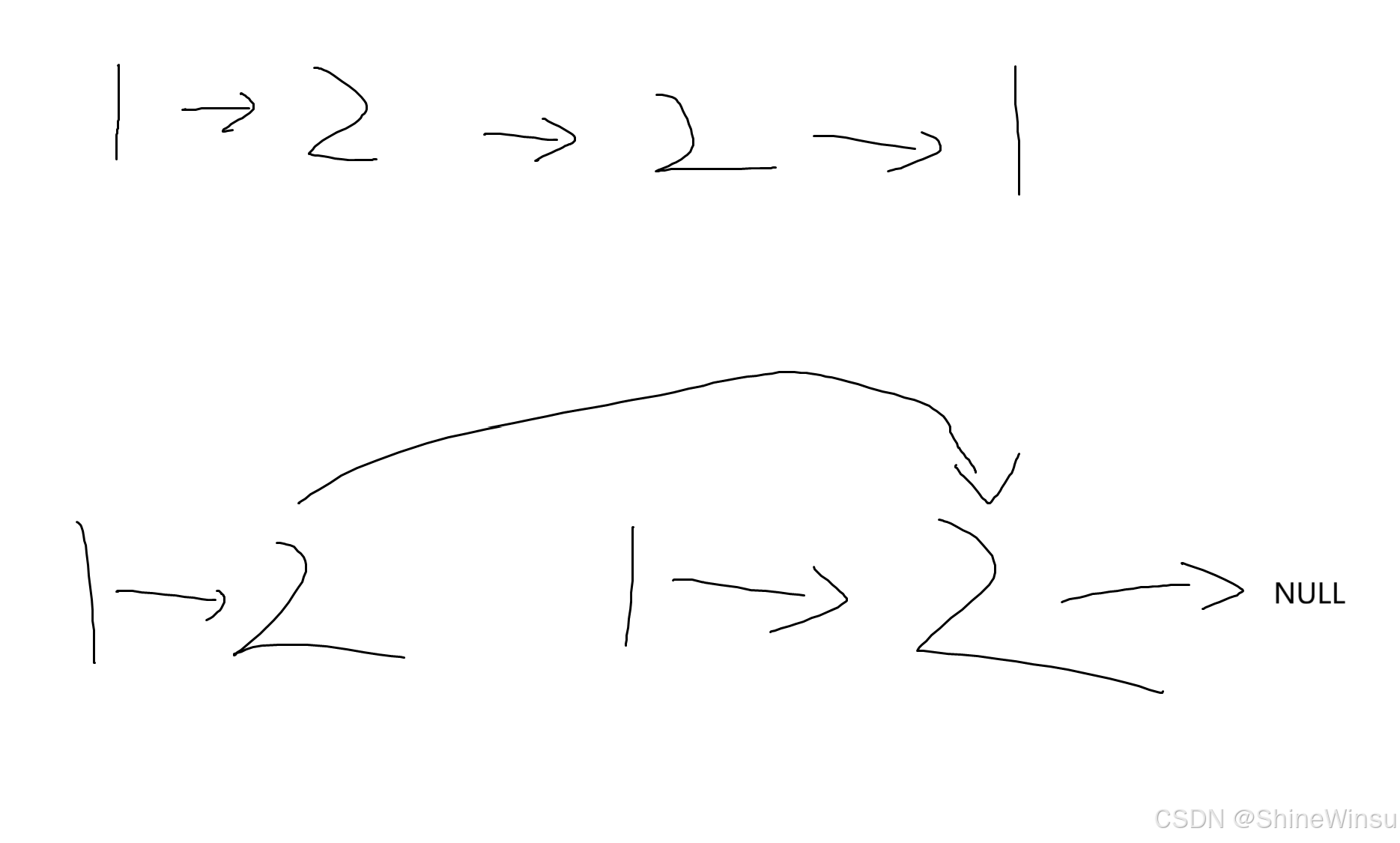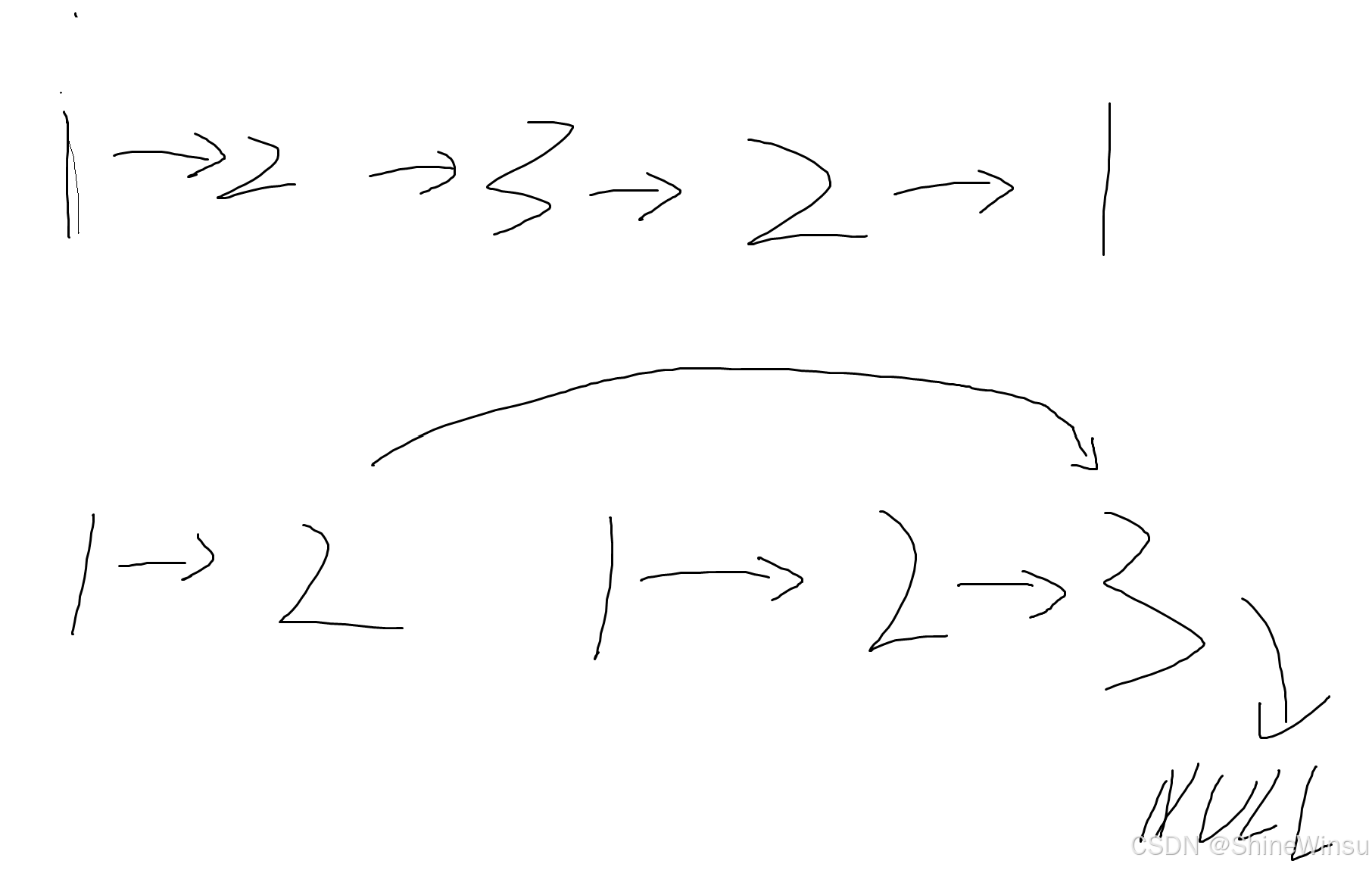 - 第二:我们要知道,由于我们是不用创建新链表的方法去翻转链表,所以即使翻转了之后,例如 1 2 1 2 3,此时的第一个2它的next指针还是指向3的,而3的next指针指向NULL,第二个1的next指针指向第二个2,第二个2的next指针指向3,即从原本的1->2->3->2->1变为