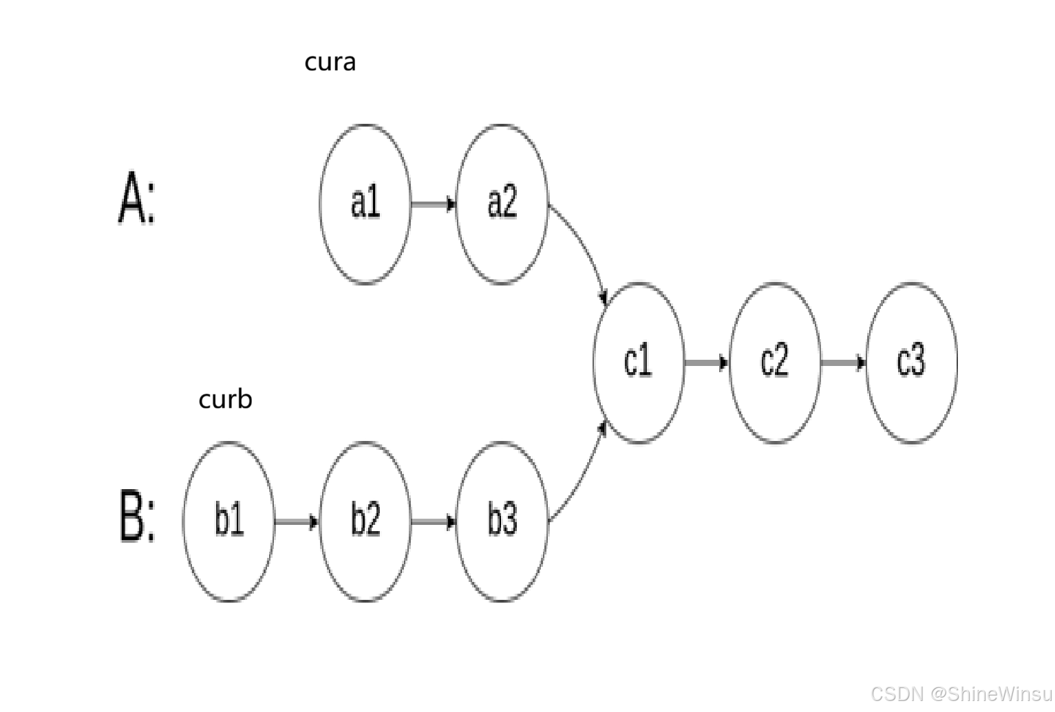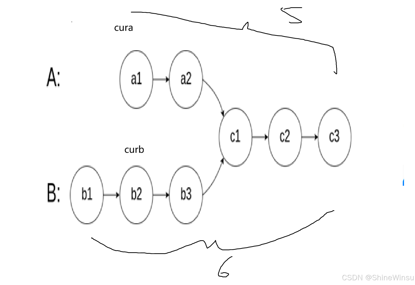 所以呢,我对上面总结一下就是,我们要让cura和curb处于相同的起跑线,因为一般来说,两个链表肯定一长一短,我们要是让cura和curb都从头结点出发,那肯定会嘎嘣脆,不行。