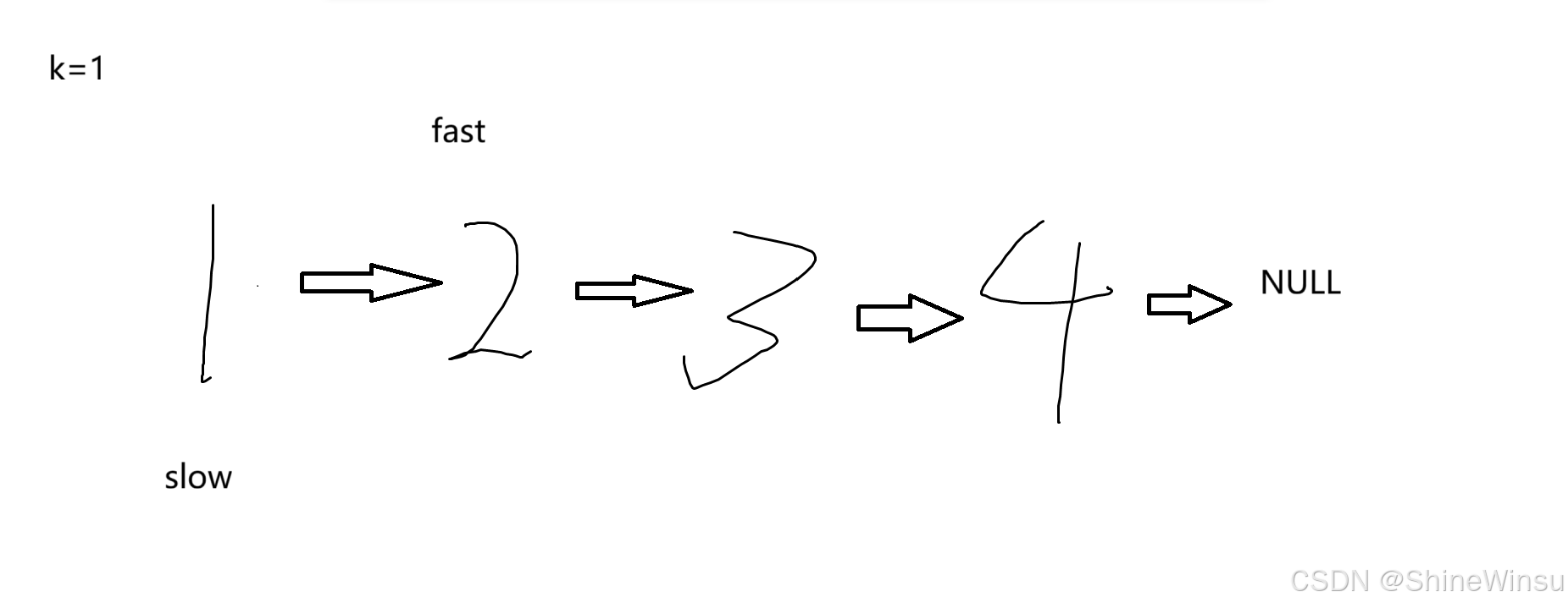 要返回倒一个节点的数据,那么这又和快慢指针有什么关系呢,根据前面所学的知识,我们知道,fast指针在为NULL的时候,终止循环,也就是说fast指针运动到了图中的NULL所示位置,那么我们不妨看看此时fast指针距离倒数第一个节点的距离为多少,巧了,正好是1,即k,那么按照惯例来说,我们的slow指针也就要在那是运动到了倒数第一个节点,那么究竟要怎么实现呢?