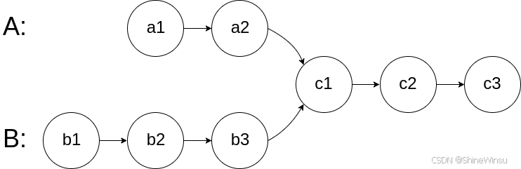 就拿题目给的例子吧,根据题目要求,我们首先要判断,这两个链表是不是相交的,说到相交,很多人觉得可能是这样子的相交: