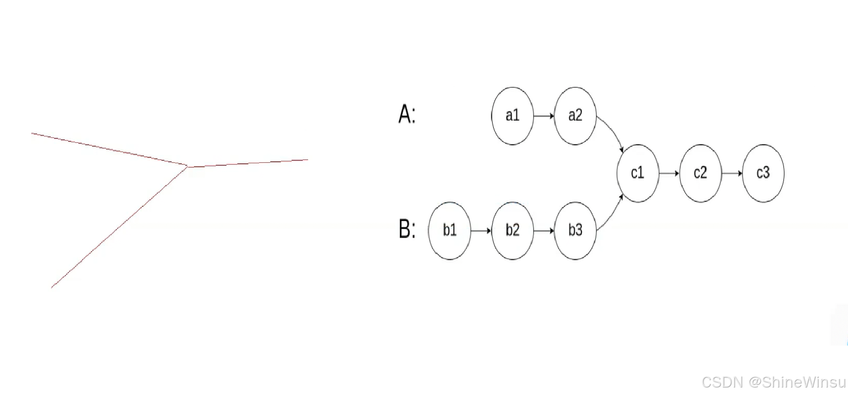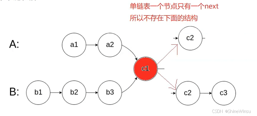 但是是这样子的嘛,其实不是的,如果是这么相交的话,那链表不就变成了这样子: