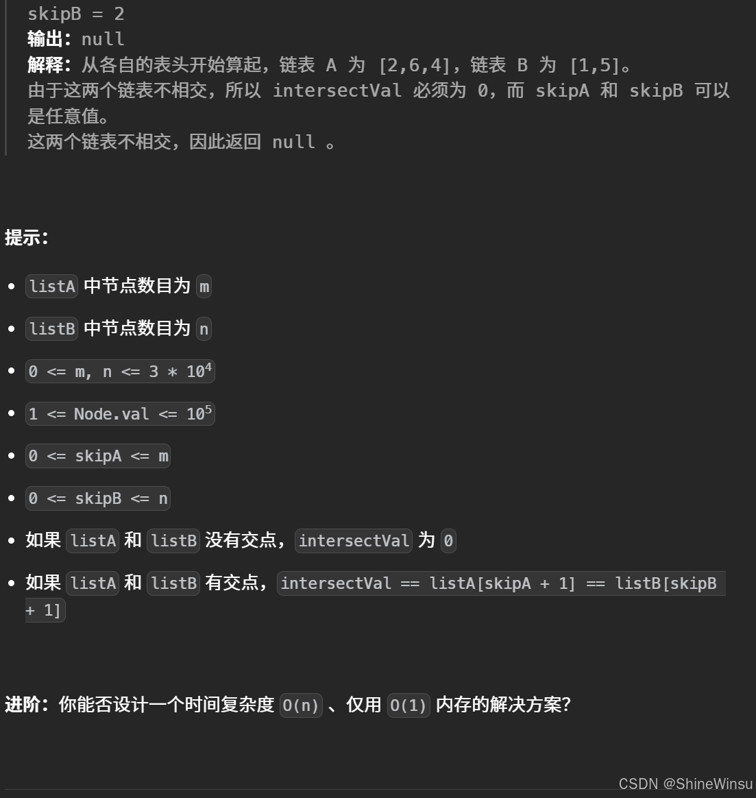 这道题要求找出两个单链表相交的起始节点,若不相交则返回 null,且要保证函数返回后链表结构不变,还需设计时间复杂度 O(n)、空间复杂度 O(1) 的解决方案。