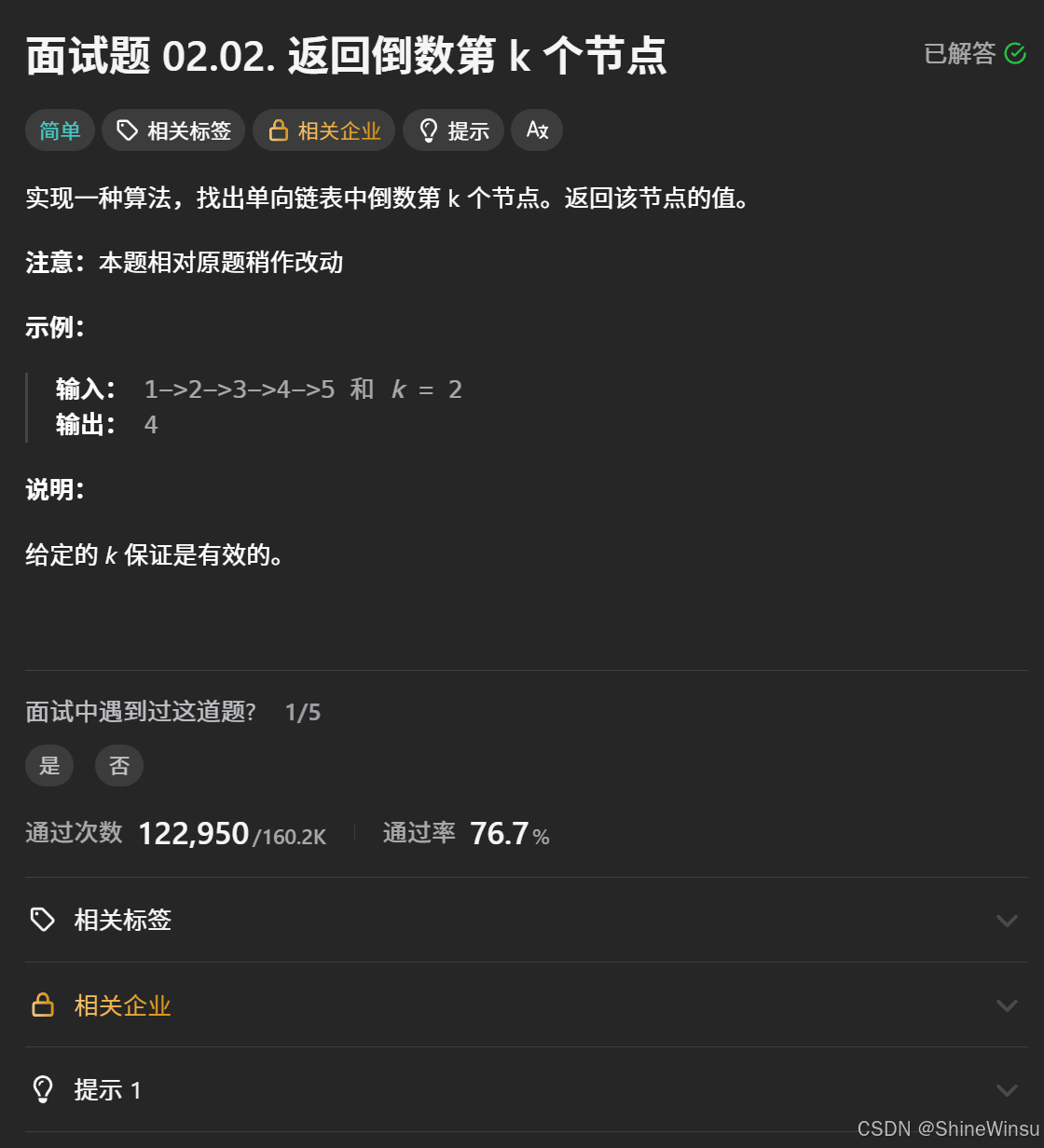 这道题要求我们找出单向链表中倒数第 k 个节点,并返回该节点的值。