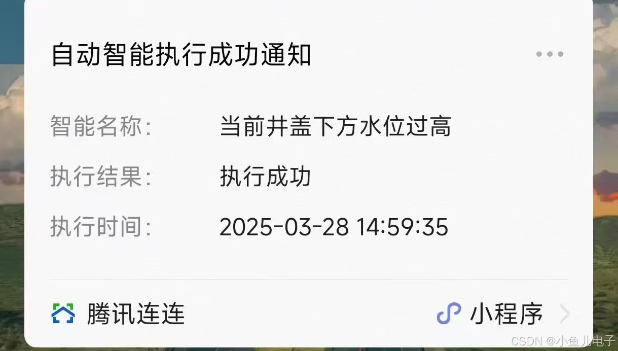 - 可燃气监测:选用MQ-9可燃气传感器实时监测井下的气体浓度,当可燃气超过设定阈值,蜂鸣器自动告警提醒,并推送消息提醒物业人员“小区1号井盖存在可燃气体,请及时处理”。