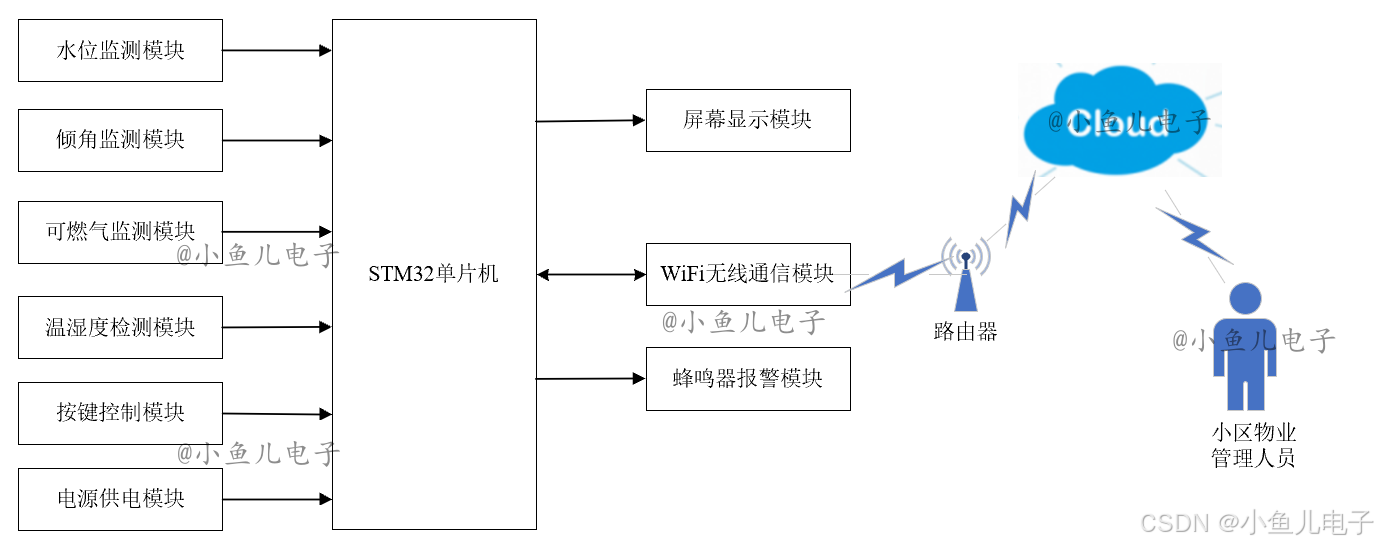 - 蜂鸣器报警模块:若单片机分析出异常(如水位过高、井盖倾角突变、燃气泄漏),则触发蜂鸣器发出警报,实现本地预警;