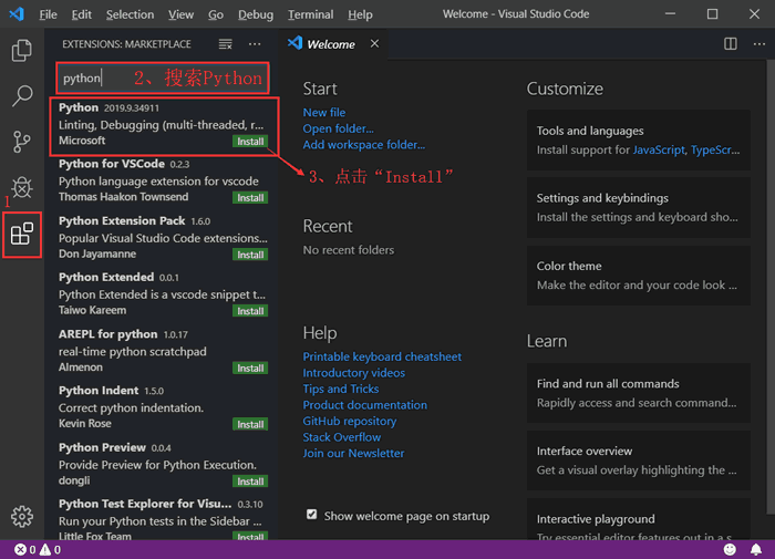 刚刚安装成功的 VS Code 是没有 Python 扩展的,安装此插件的方法也很简单。按照下图所示,点击“扩展”按钮,并搜索 Python 扩展插件,找到合适的扩展(这里选择的是第一个,这是 Python 的调试工具),选择“Install”即可安装成功。