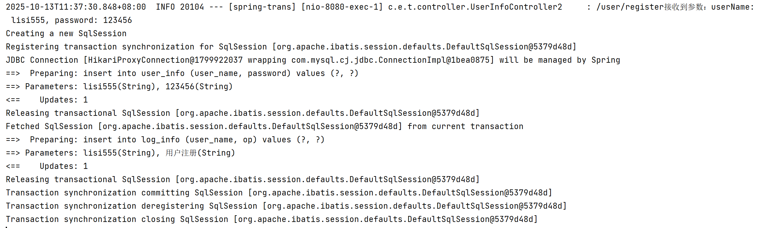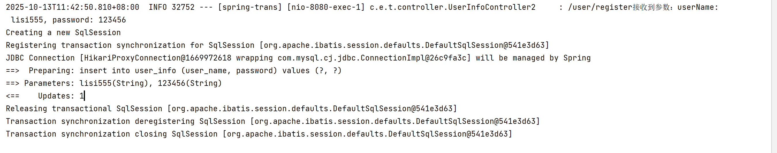 public class UserInfoController2 {@Autowiredprivate UserInfoService userInfoService;// @Transactional 自动实现事务的开启,提交或者回滚@Transactional(rollbackFor = Exception.class)@RequestMapping("/register")public Boolean register(String userName, String password) throws IOException {// 1. 参数校验log.info("/user/register接收到参数:userName: {}, password: {}", userName, password);if(!StringUtils.hasLength("userName") || !StringUtils.hasLength(password)){return false;}// 2. 调用 servicetry{Integer result = userInfoService.insertUserInfo(userName, password);int n = 10 / 0;if(result <= 0){return false;}}catch (Exception e){throw new IOException();}return true;}