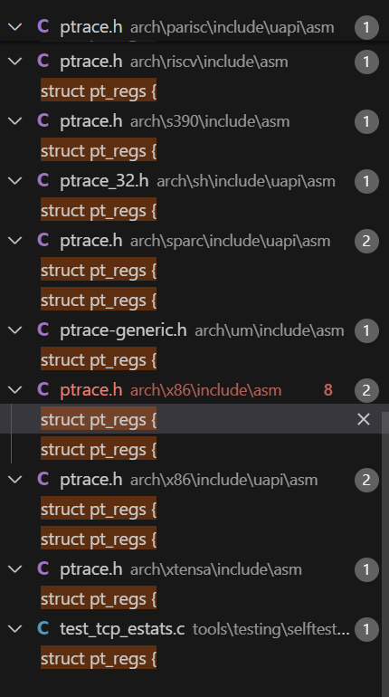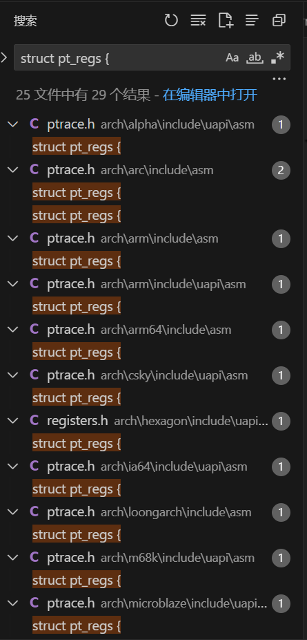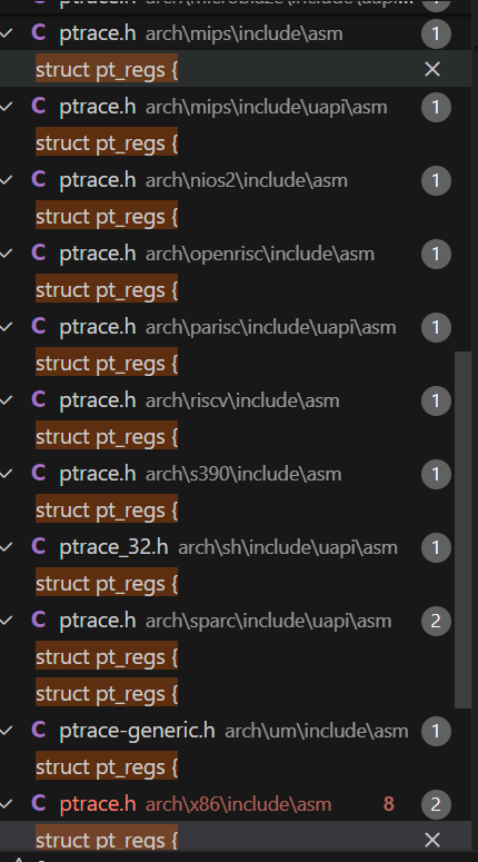 struct pt_regs寄存器是体系结构相关的,在Linux内核源码中搜索,可以看到多个结果: