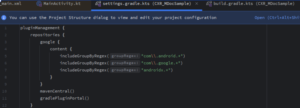 pluginManagement {repositories {google {content {includeGroupByRegex("com\\.android.*")includeGroupByRegex("com\\.google.*")includeGroupByRegex("androidx.*")}}mavenCentral()gradlePluginPortal()}