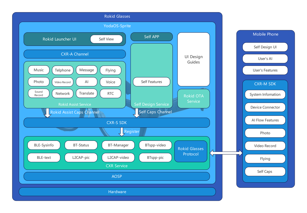 CXR-M SDK 是面向移动端的开发工具包,主要用于构建手机端与 Rokid Glasses 的控制和协同应用。开发者可以通过 CXR-M SDK 与眼镜建立稳定连接,实现数据通信、实时音视频获取以及场景自定义。它适合需要在手机端进行界面交互、远程控制或与眼镜端配合完成复杂功能的应用。目前 CXR-M SDK 仅提供 Android 版本。