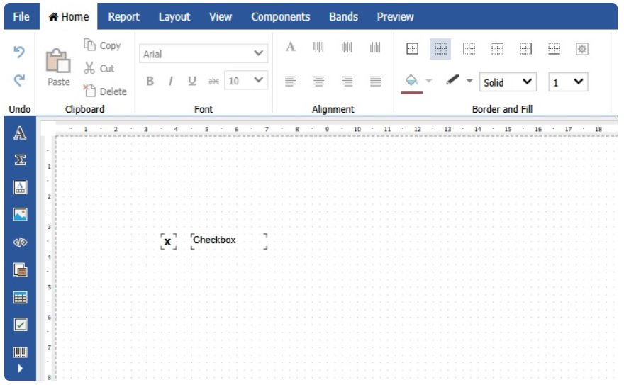 在 2026.1 版本中,为 .fr3 格式(FastReport VCL)的报表新增了一个复选框组件。该组件表示一个布尔字段,用于在报表中显示“开/关”状态。复选框可用于报表页面,以可视化来自数据源的布尔值或实现交互式用户交互。该组件支持 FastReport VCL 的所有核心属性,包括外观自定义、数据绑定和事件处理。