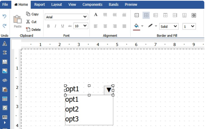 新增了组合框组件——一个带有预设值的下拉列表。该组件允许用户从预定义的选项列表中选择一个选项。这些功能将有助于您创建交互式报表和对话框,尤其适用于需要将用户选择限制在特定值范围内的情况。组合框支持自定义项目列表,并且可以绑定到数据源以动态填充值。