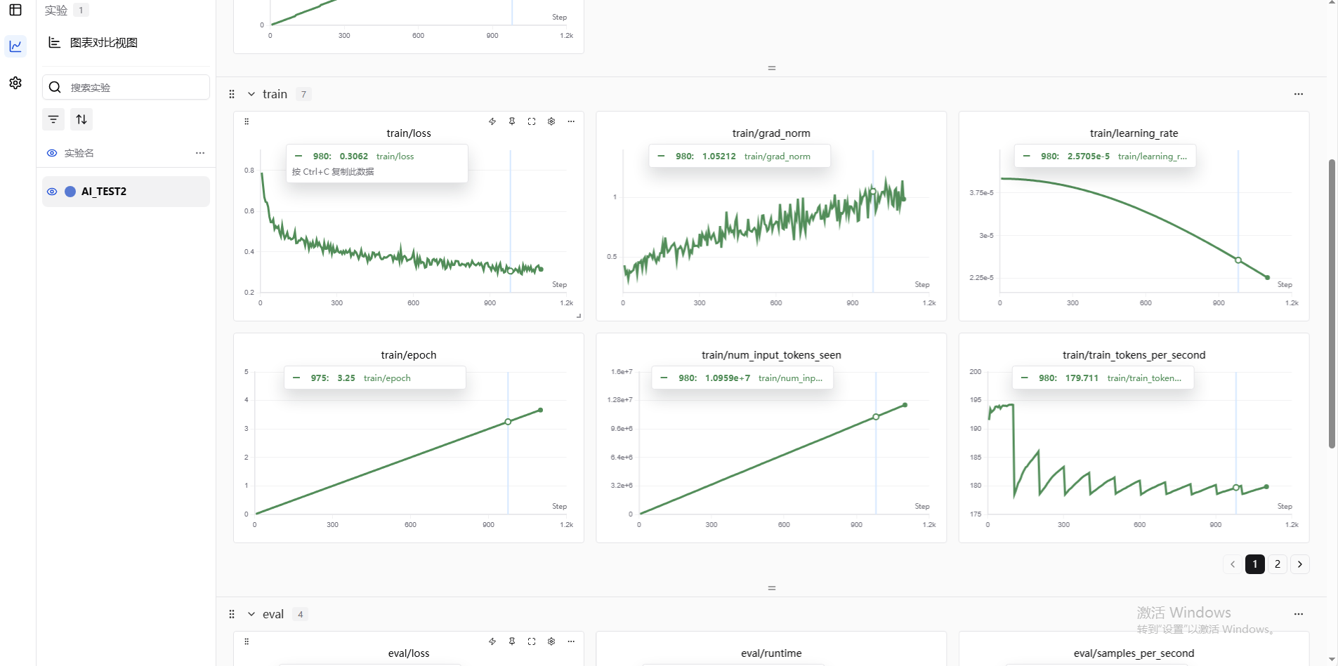 train/num_input_tokens_seen(已处理Token数) | 曲线线性增长,斜率恒定。 | 表明数据流供给稳定,没有中断。结合 |