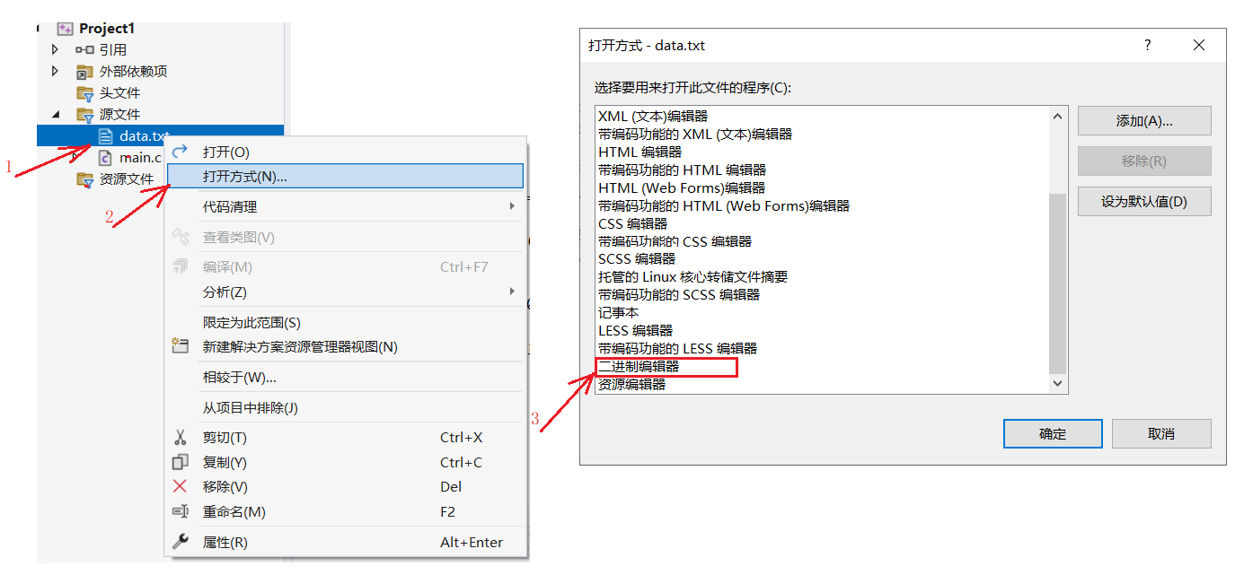 源文件-->添加现有项-->添加二进制文件-->右击二进制文件选打开方式-->下滑到选择二进制编辑器