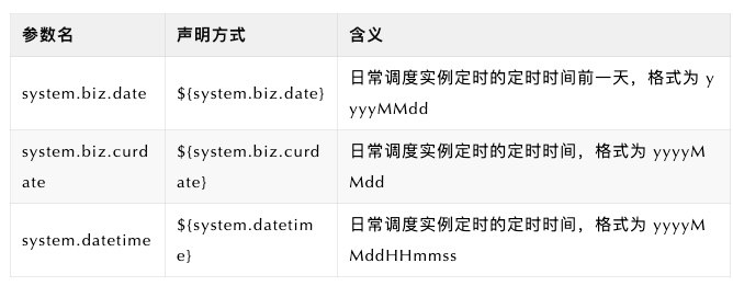 DolphinScheduler 提供了几个常用的系统级内置参数,主要用于获取调度实例的执行时间。这些参数无需定义,直接引用即可。