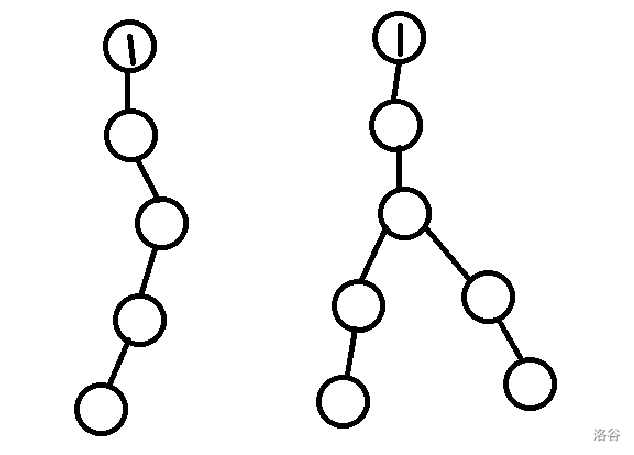 那么合法的树就只有两种形态,一种直接退化成链,另外一种只有一个节点有两个子节点,如下图。(有点丑见谅)