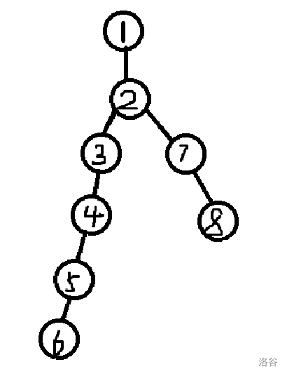 我们先从下往上同时填数直到较短链到达两个叶子的 LCA,目前已经填好权值的节点是 \(5\)、\(6\)、\(7\)、\(8\),此时还是两种可能。