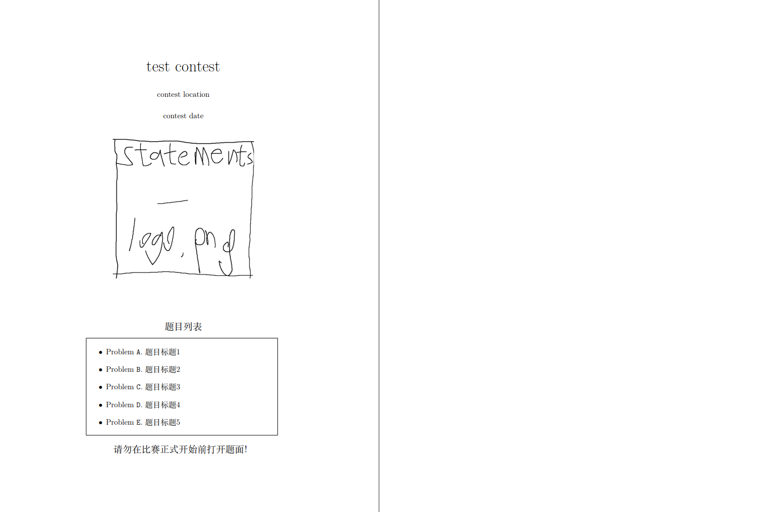 如果你希望用 LaTeX 制作封面的话,可以修改比赛 Properties/Files 页面中的 statements.ftl 文件。把相关 LaTeX 语句加在 \begin{document} 的开头。