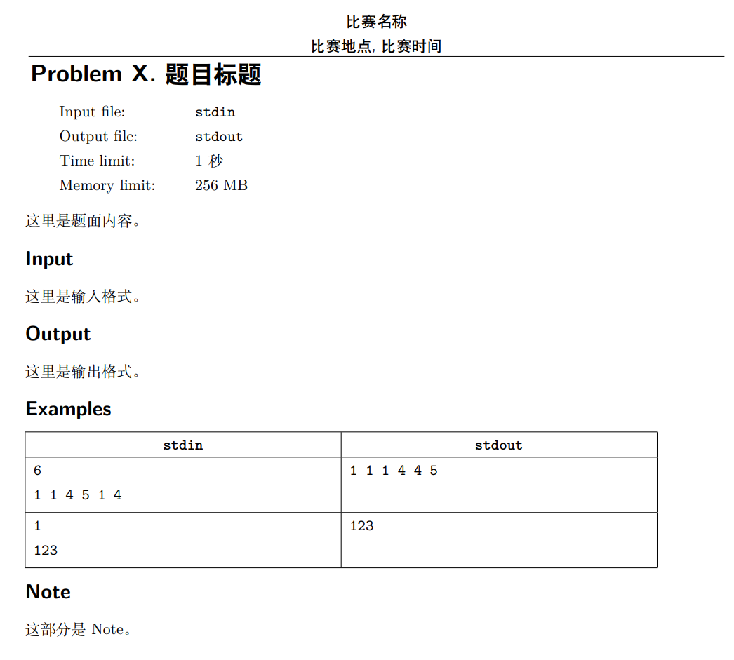 Name:题目标题Legend:题目内容Input:输入格式Output:输出格式Notes:样例说明等其他补充说明