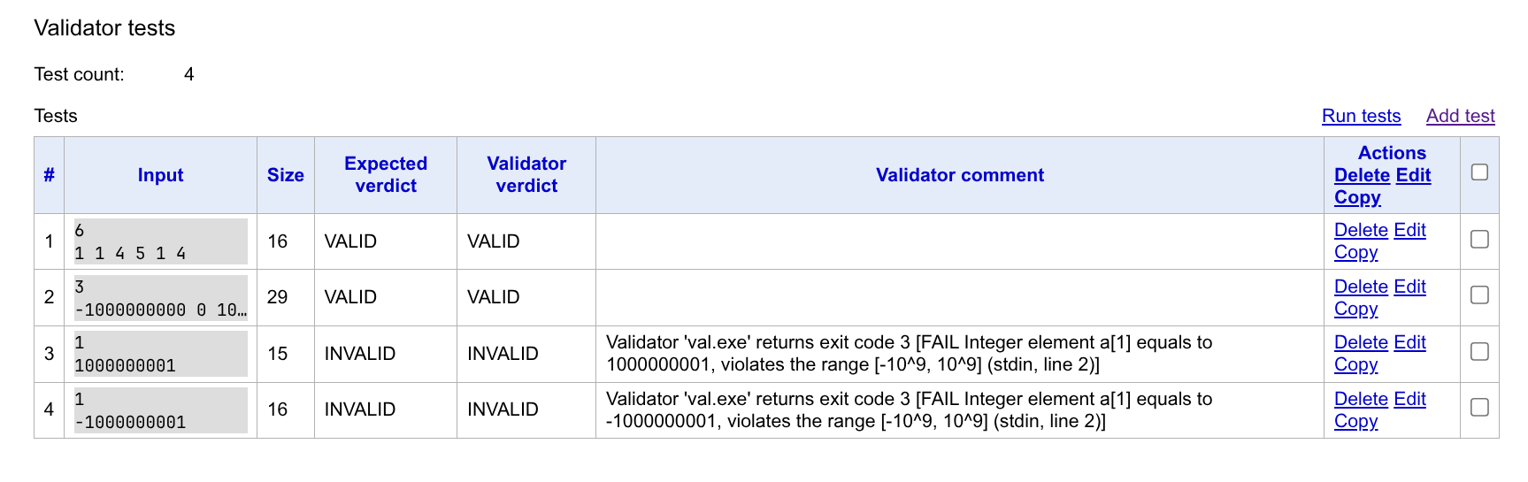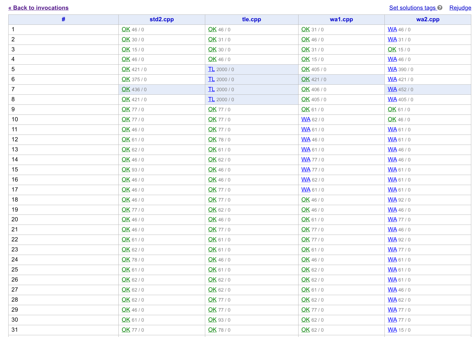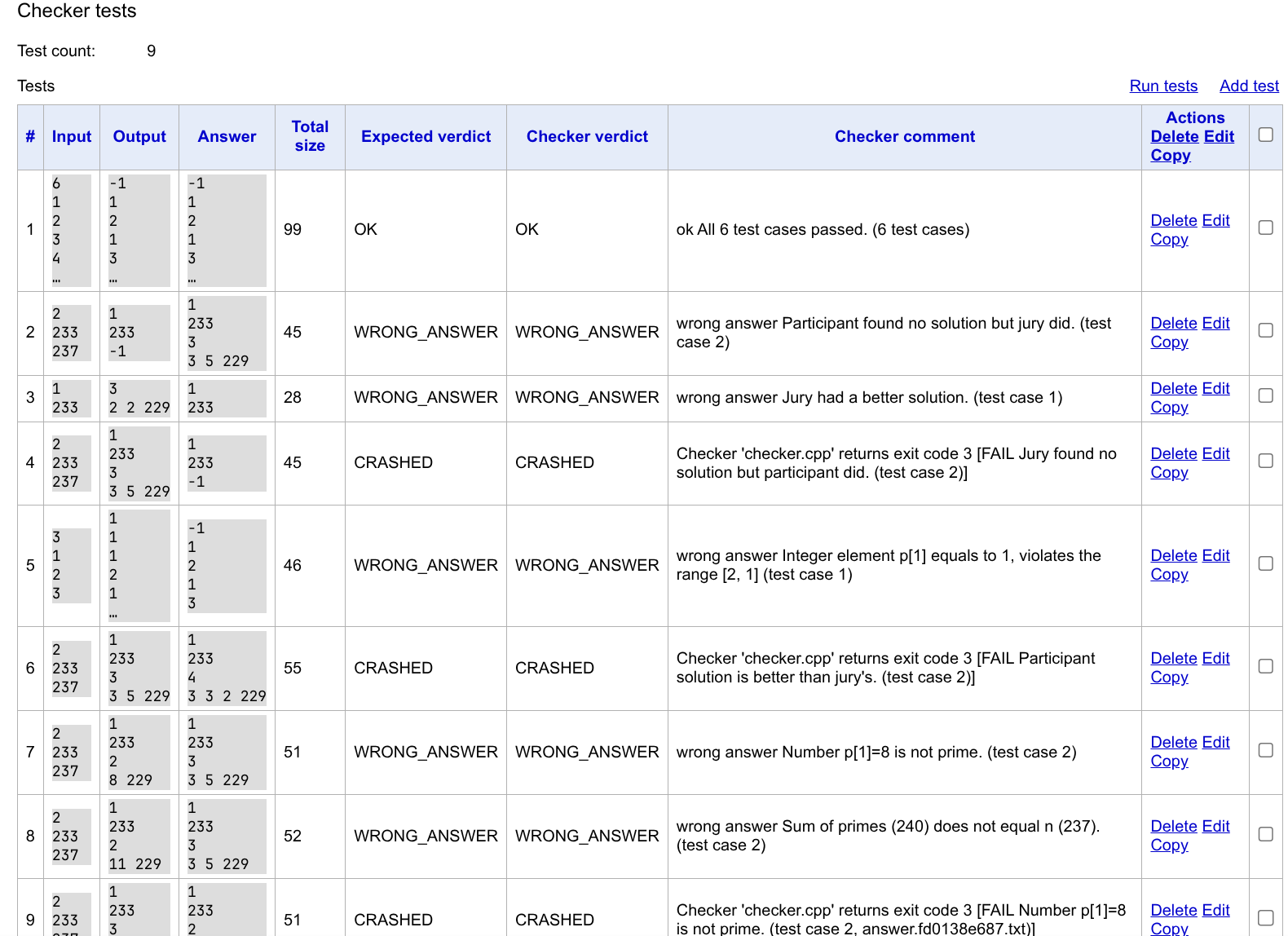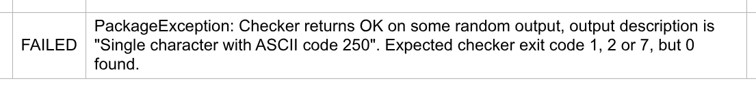 | Time limit exceeded | 所有数据的运行结果只能是 AC 或者 TLE,且必须在部分数据上 TLE。你可以把复杂度不对的解都标记为这一类。如果它在一倍时限的情况下超时,二倍时限的情况下通过,Polygon 也会给你相应警告,但是能够通过 Verification。 | |