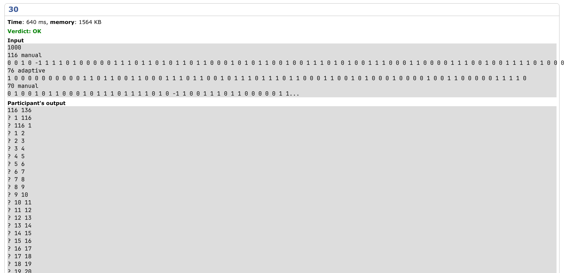 | Memory limit exceeded | 所有数据的运行结果只能是 AC 或者 MLE,且必须在部分数据上 MLE。 | |