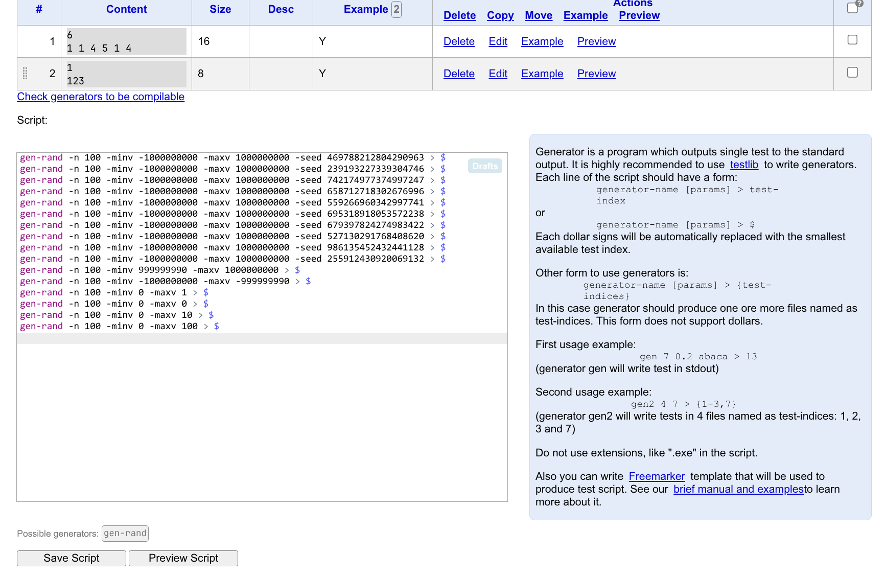 - 在 Polygon 上,你可以编写 Validator,用于进行输入数据合法性的检验。编写正确的 Validator 可以有效防止错误数据的出现:比如一行输入 \(n\) 个数,但是实际只有 \(n-1\) 个;输入保证是凸包,但是数据中出现了凹包;输入格式要求 \(a_i \geq 1\),但是数据中出现了 \(0\)。