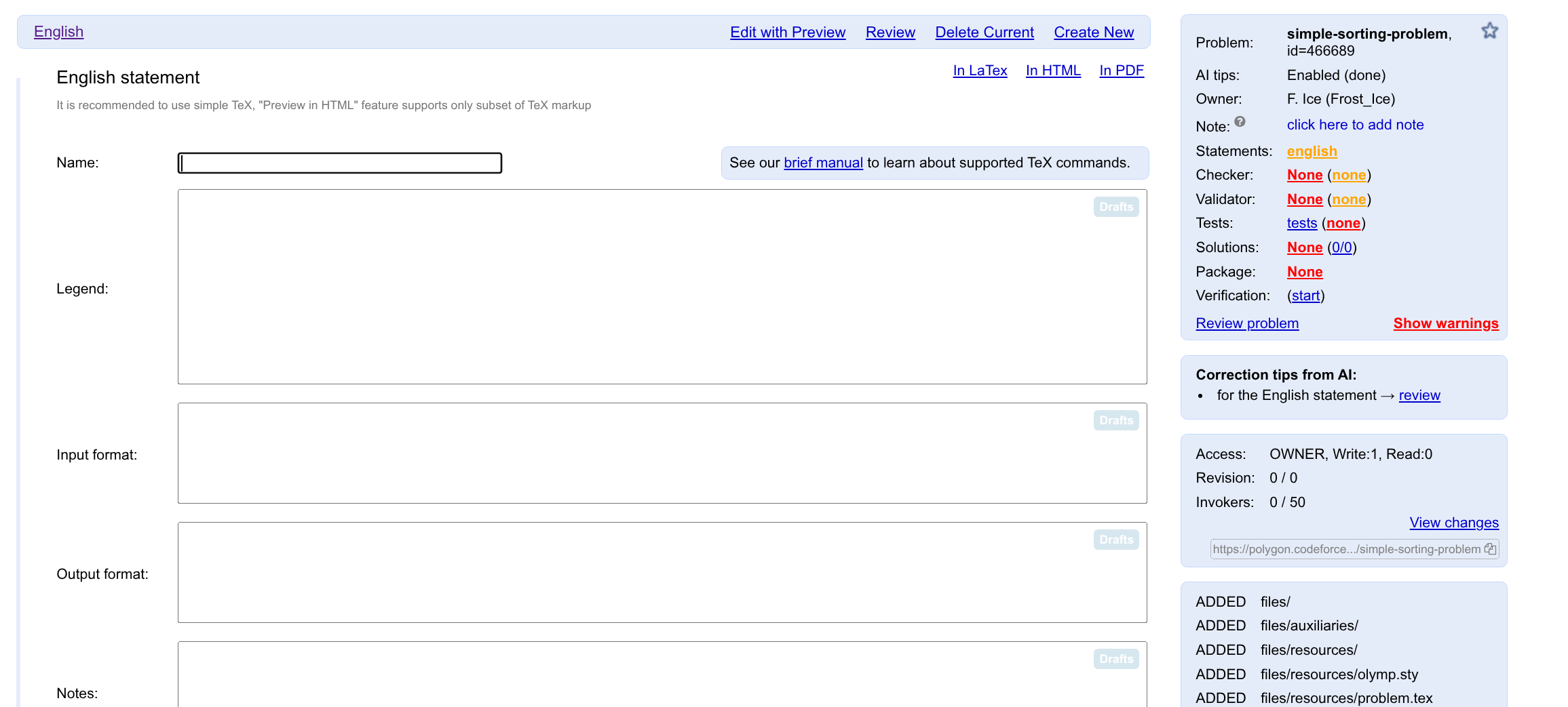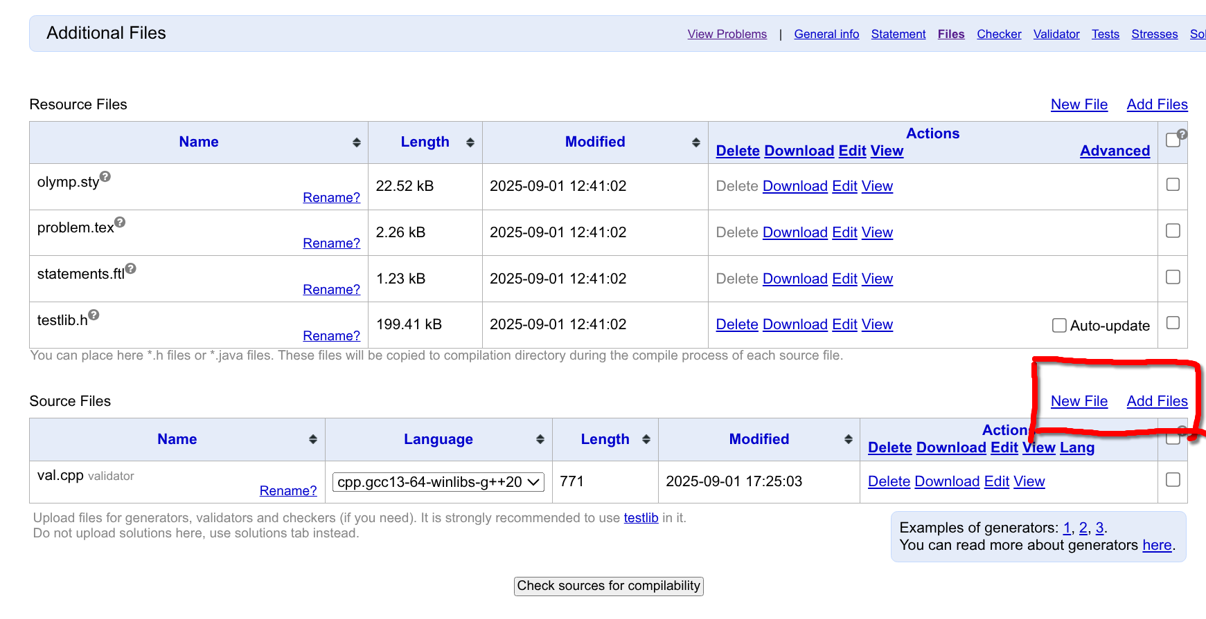 problem.tex文件,负责该题目本身的题面内容(即,\begin{problem}和\end{problem}之间的内容) - 比赛 Properties/Files 页面中的