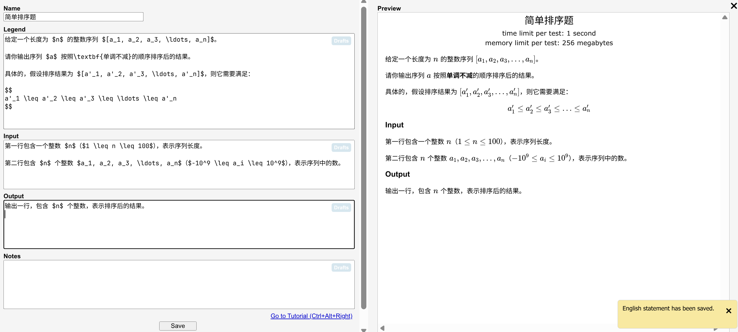 对于中文题面,可以参考洛谷题面规范,以及牛客/洛谷的近期比赛题目进行编写(不建议参考洛谷早期题库题目,也不建议参考牛客主题库的题目,其中题面乱写或是不规范的太多了)。