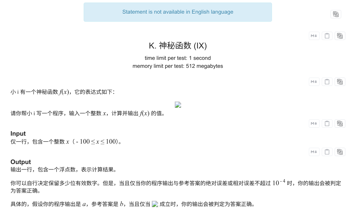 Codeforces 的题目渲染存在一个奇怪特性。只要你选择的不是英文或是俄文,将题目导入 Codeforces 之后,题面数学公式将无法正常渲染。具体情况可能如图。