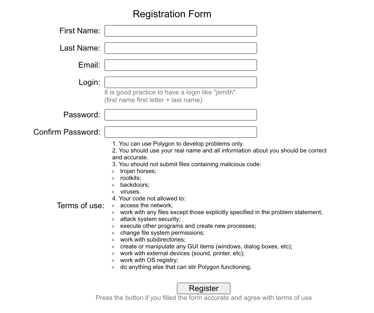 Email这里建议填一个你的常用邮箱。与 Codeforces 本站不同,Polygon 是有 2FA 的。当你太久没登录,亦或是在其他设备上登录,Polygon 都会给你的邮箱发一个验证链接,要求你通过验证链接完成登录。 -