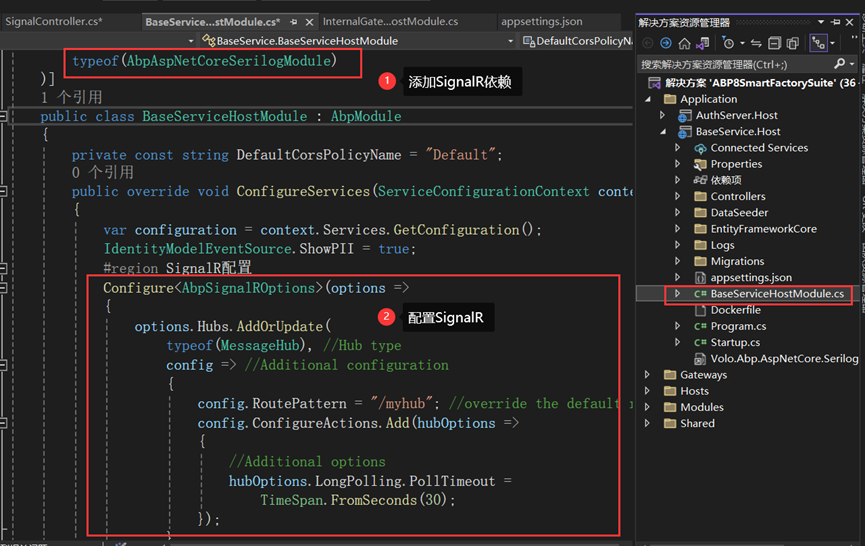 说明:可以按照标准的微软教程添加SignalR到你的应用程序,但ABP提供了简化集成的SignalR集成包。