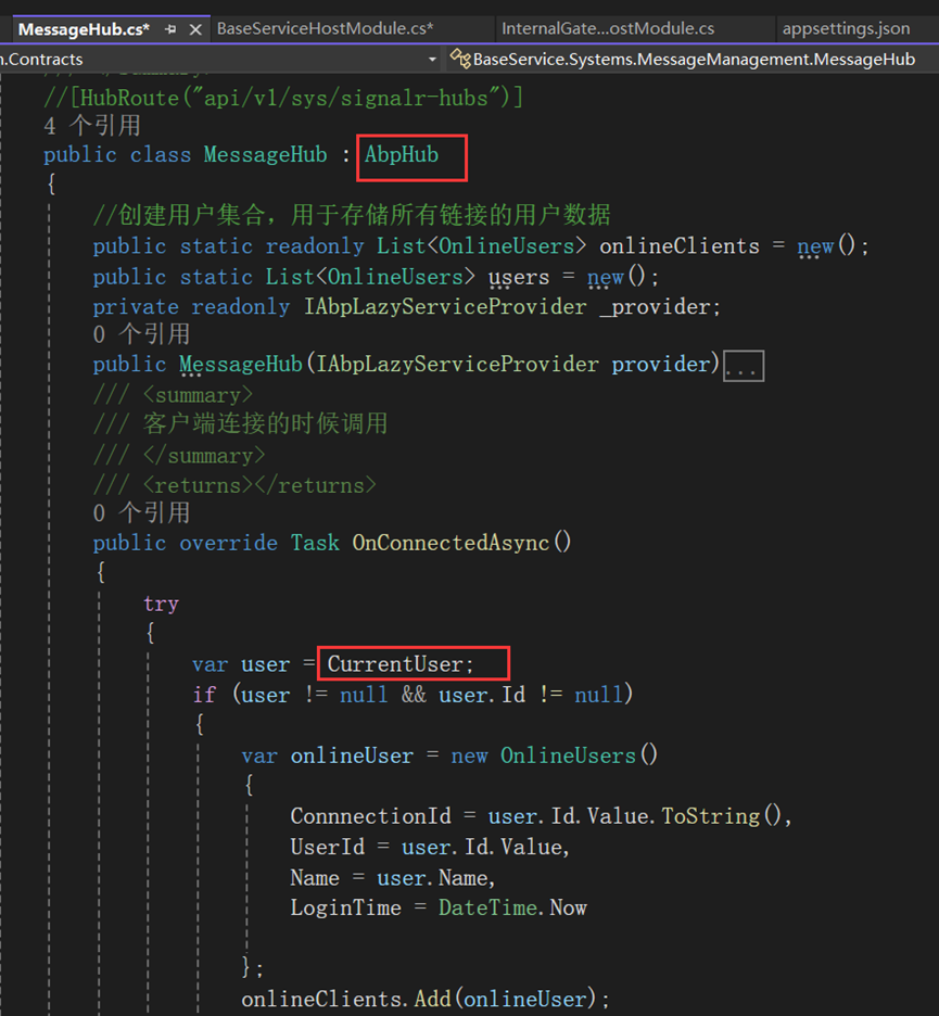可以从 AbpHub 或 AbpHub<T> 继承标准的 Hub 和 Hub<T> 类,它们具有实用的基本属性,如 CurrentUser,示例代码如下图所示。