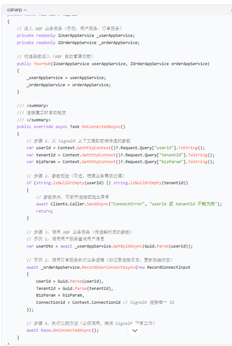 明确一点:SignalR 的 OnConnectedAsync 是生命周期方法,无法直接添加自定义参数(连接建立时自动触发,由 SignalR 框架调用),但可通过「连接时携带参数 + 后端解析」的间接方式传递参数,再在该方法中调用 ABP vNext 业务服务。