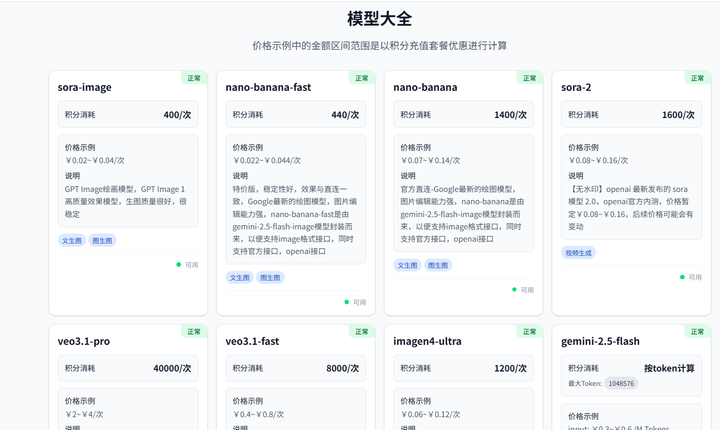 支持多种主流生成模型,包括图片,视频模型: Sora-Image(Gpt4o)、Sora2、Noro-Banana、Veo3.1,Veo3.0 等