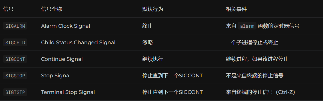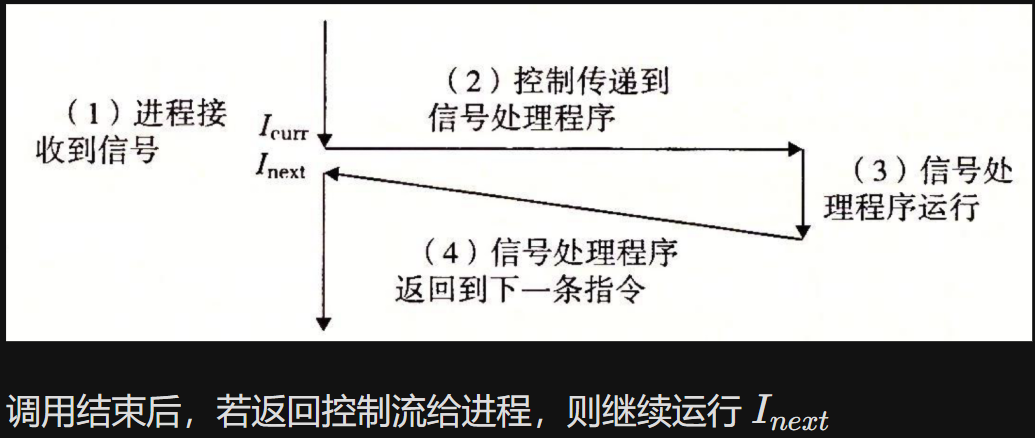 忽略、终止、捕获并调用信号处理函数三种行为之一进行处理,直到集合为空,将控制转移为下一条指令。 - 信号处理有以下四种默认行为: