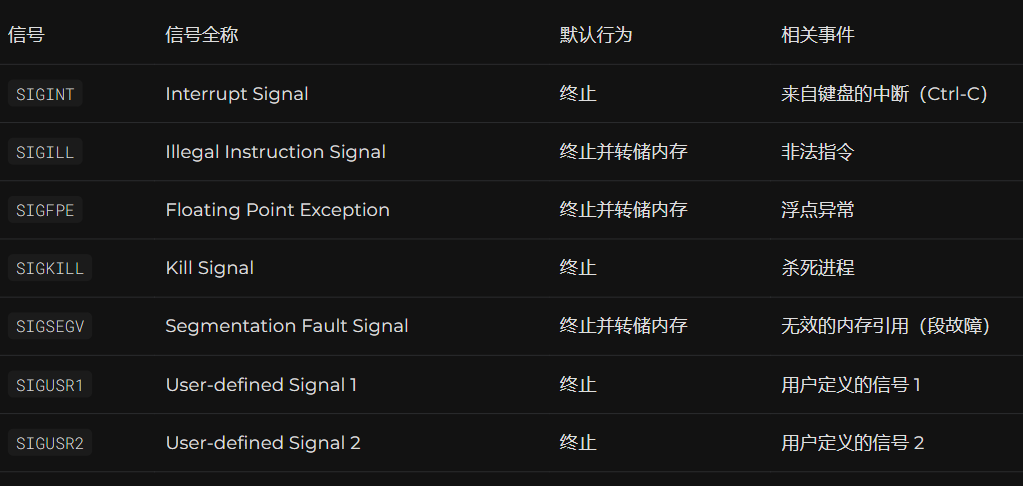 SIGINT、SIGKILL - 进程终止并转储内存,如
