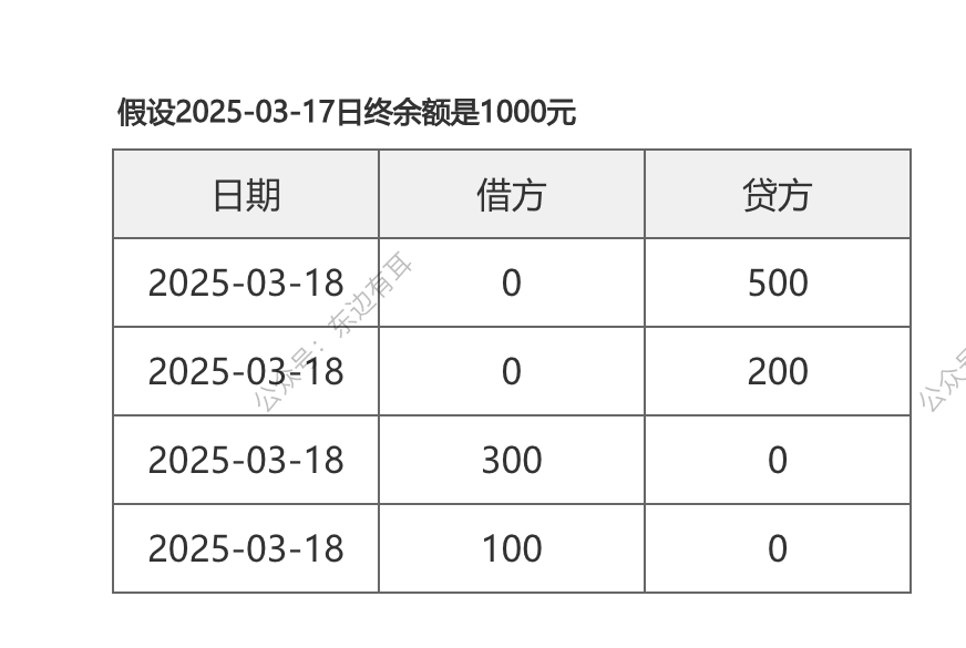 根据上述信息,那么在 2025-03-18 日的余额为:上日余额 + 今日贷方发生额-今日借方发生额=今日余额,即:1000+500+200-300-100=1300