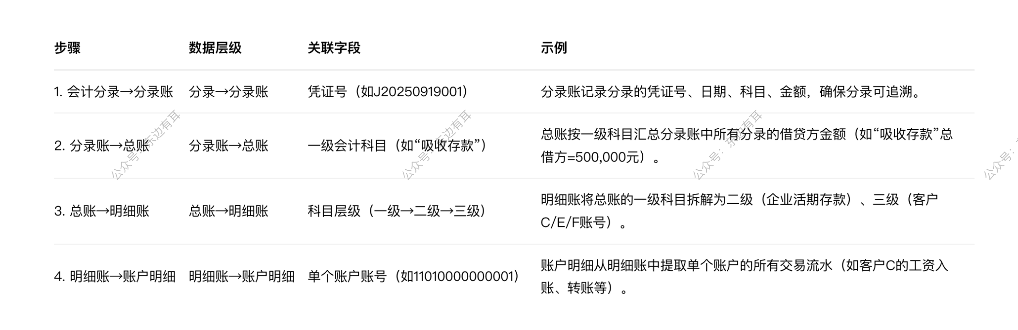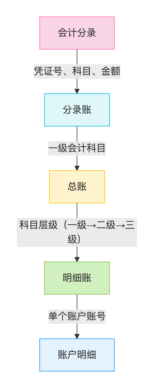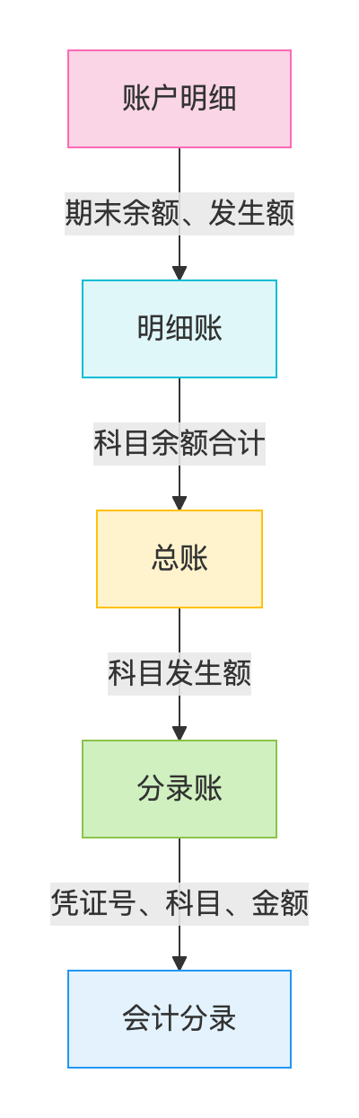 单笔交易从会计分录开始,逐步汇总到分录账、总账、明细账,最终细化为单个账户的流水,形成“数据金字塔”