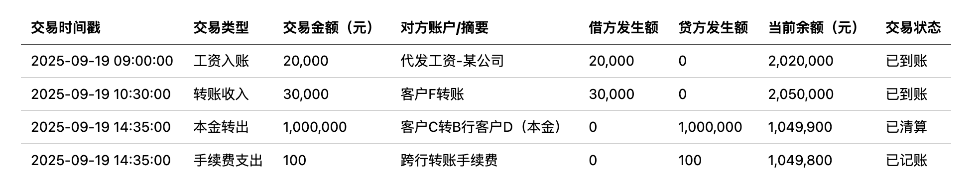- 账户流水明确区分本金转出(100 万元)和手续费支出(100 元),与实际清算路径一致。