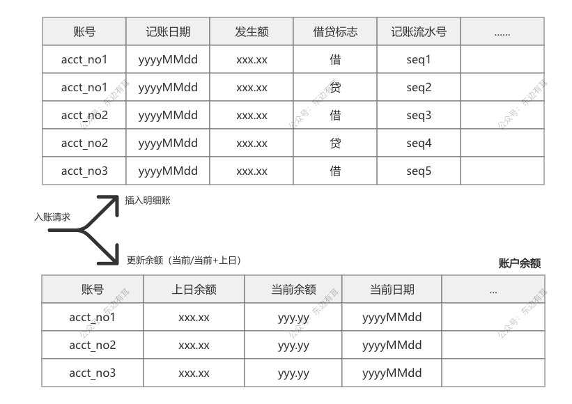 - 账户余额:记录账户的当前最新的余额,一般设计的字段有账号,工作日期,昨日余额,当前余额。其中当前余额到凌晨后(日切后)就变成了昨日余额,主要是进行更新操作。昨日余额很重要,一般目的是进行核算,毕竟跑批核算一般是在次日凌晨,余额是一直在变化的。