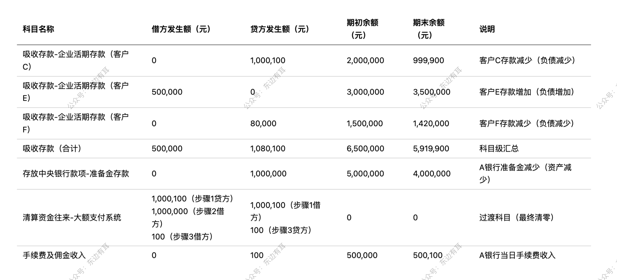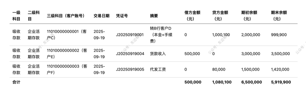 - 吸收存款科目按客户拆分,客户 C(贷方 1,000,100 元)、客户 E(借方 500,000 元)、客户 F(贷方 80,000 元),合计贷方 1,080,100 元,借方 500,000 元。