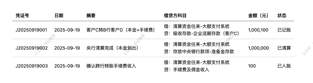 客户 C(A 银行对公客户,账号:11010000000001)于 2025 年 9 月 19 日 14:30 通过 A 银行网银向客户 D(B 银行对公客户,账号:22010000000001)转账 100 万元,A 银行收取 100 元手续费(合计扣款 1,000,100 元),通过大额支付系统完成清算