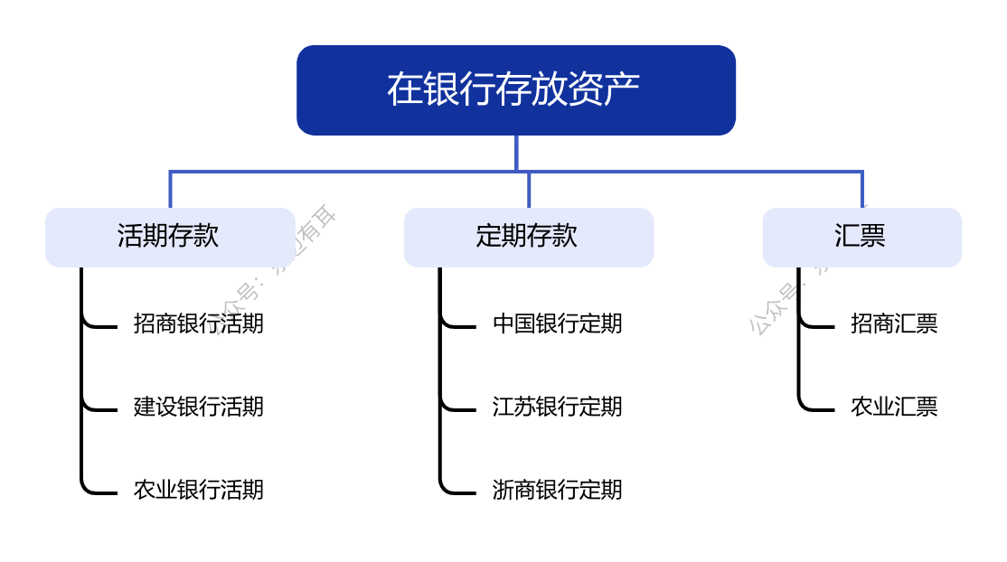 例如,在银行存放资产下面可以分级为活期存款 、定期存款、汇票。活期存款可以继续分级到招商活期存款 、建设银行定期存款等