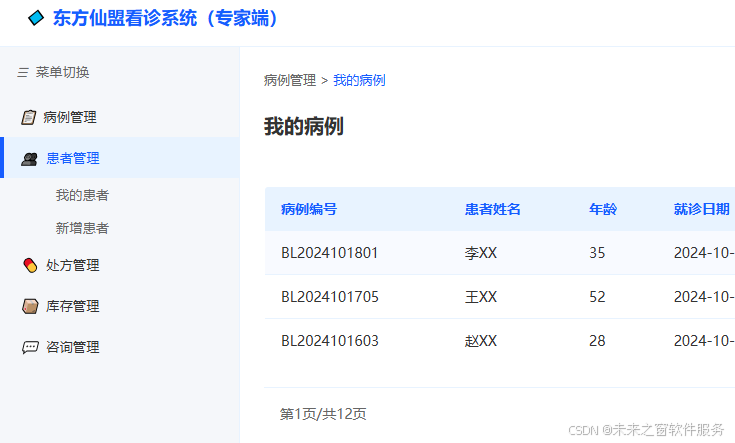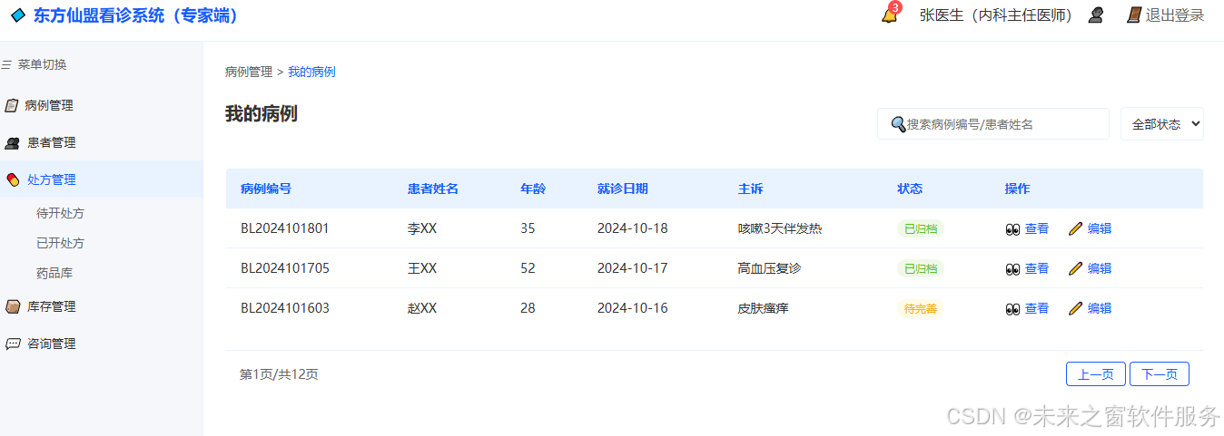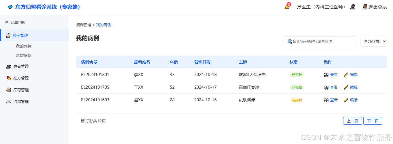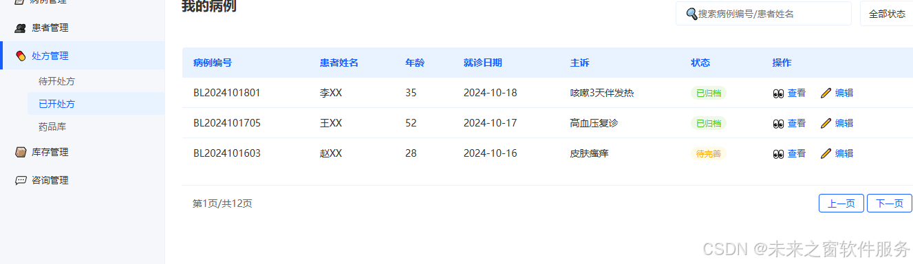 │ │ 病例编号 患者姓名 年龄 就诊日期 主诉 状态 操作 │ │