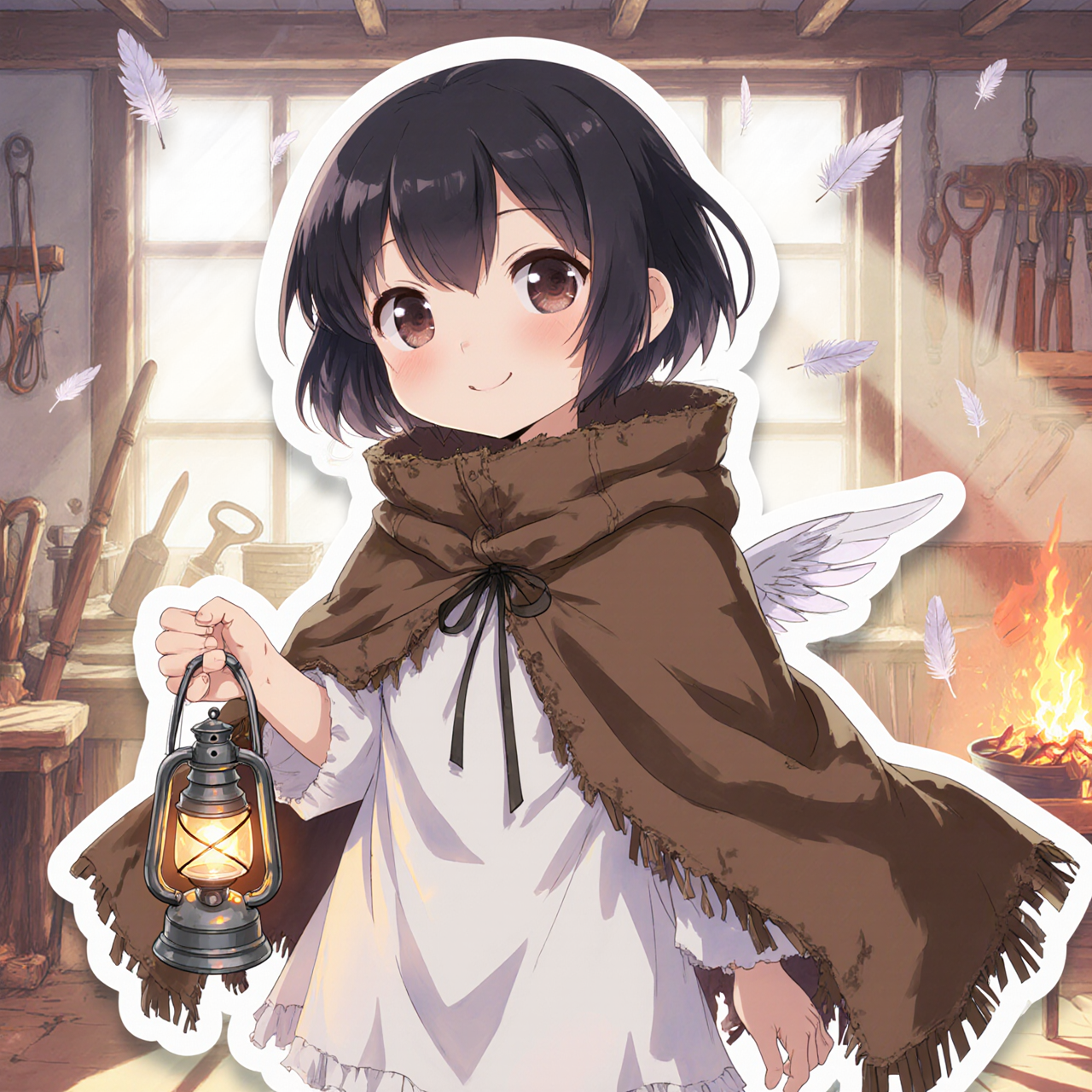 动漫贴纸风格的《灰羽联盟》光插画,展现她青春活泼的表情,明亮好奇的眼睛和温暖的笑容。她穿着标志性的大号破旧棕色斗篷,高领设计,内搭简单白色连衣裙。突出她凌乱的短黑发和背部隐约可见的小羽翼。让她摆出俏皮的姿势,手持手工灯笼或小工具,体现她的工匠角色。使用柔和的粉彩色调和干净的线条,强调半Q版、贴纸般的美学,带轻微赛璐珞阴影。在温馨的阳光工作坊背景中,加入木制工具、发光的余烬或漂浮的羽毛增添氛围。添加细微的网点纹理和白色边框,强化贴纸效果。