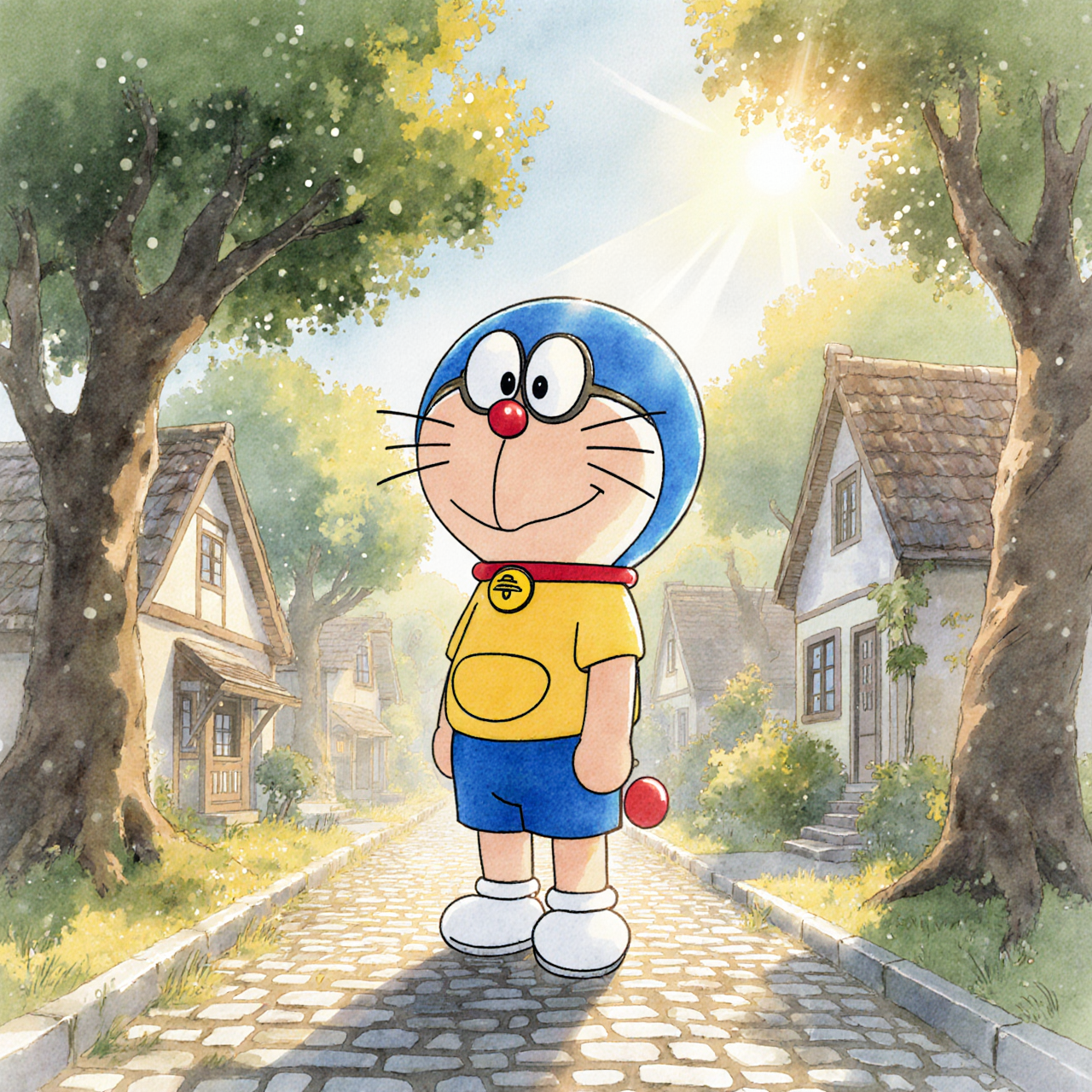 《哆啦A梦》野比大雄的吉卜力风格插画,充满魅力,带有柔和的绘画纹理和温馨怀旧的光影。大雄穿着标志性的黄色衬衫、蓝色短裤和圆框眼镜,采用细腻的水彩笔触和精致细节呈现。他的表情温柔中带点淘气,展现好奇又善良的本性。背景是一个梦幻的郊区街景,阳光洒落,树影婆娑,鹅卵石小径和带有吉卜力特色奇幻建筑的温馨房屋。空气中弥漫着淡淡的魔法光辉,暗示哆啦A梦的存在。色调柔和却鲜活,包含大地绿、温暖黄和柔和蓝,营造出宁静的绘本氛围。细微的尘埃颗粒和光线增添电影般的质感,融合现实与奇幻。