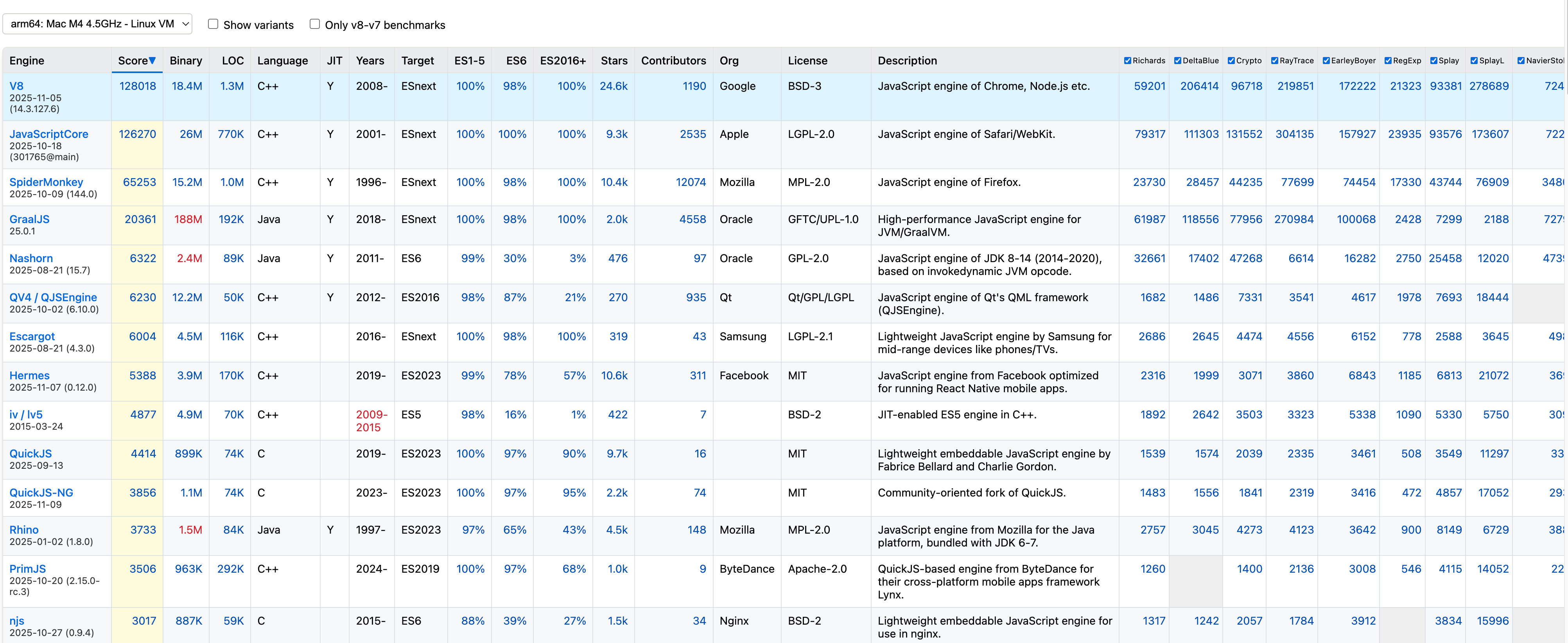 包含上百种 JS 引擎的基本信息 ES 支持程度,性能等对比信息。