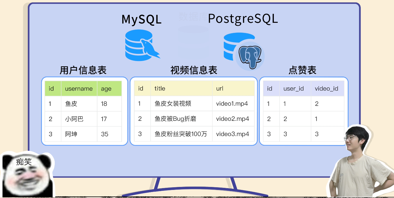 有了服务器,还得有数据库,用来存储网站的用户信息、视频信息、评论点赞这些数据。