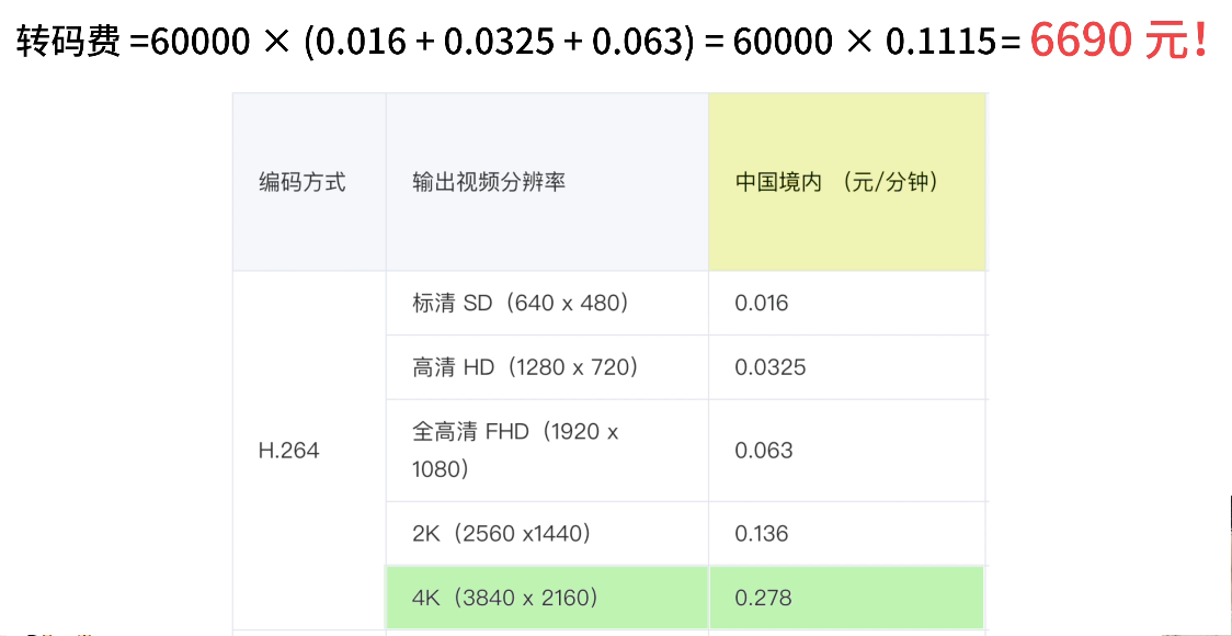 一般按照清晰度和视频分钟数计费。如果你上传 1000 个小时的高清视频,光转码费就得几千块!